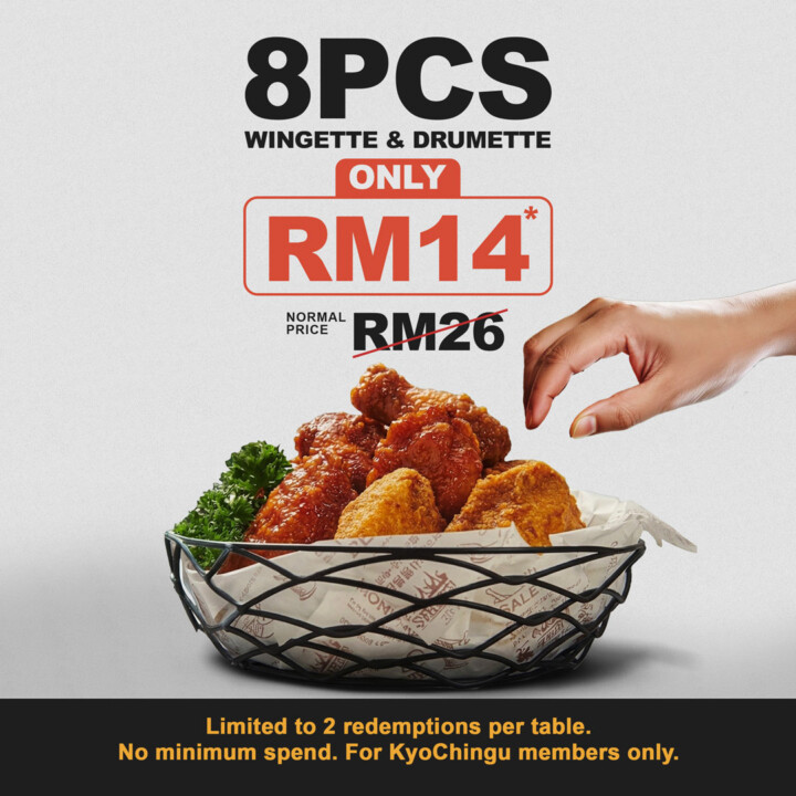 Enjoy 8pcs Wingette & Drumette for RM14, exclusively for KyoChingu members on 14th of the month.